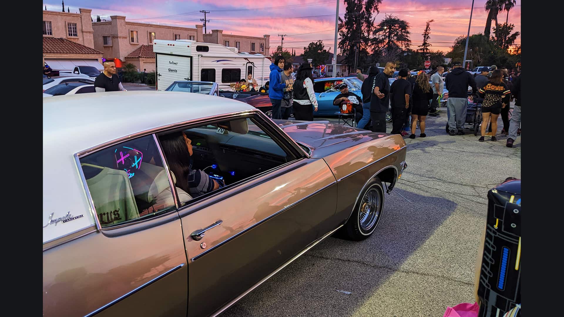 Tricked-out classics and gleaming lowriders shine at dusk during Valley Alarm’s Halloween celebration.